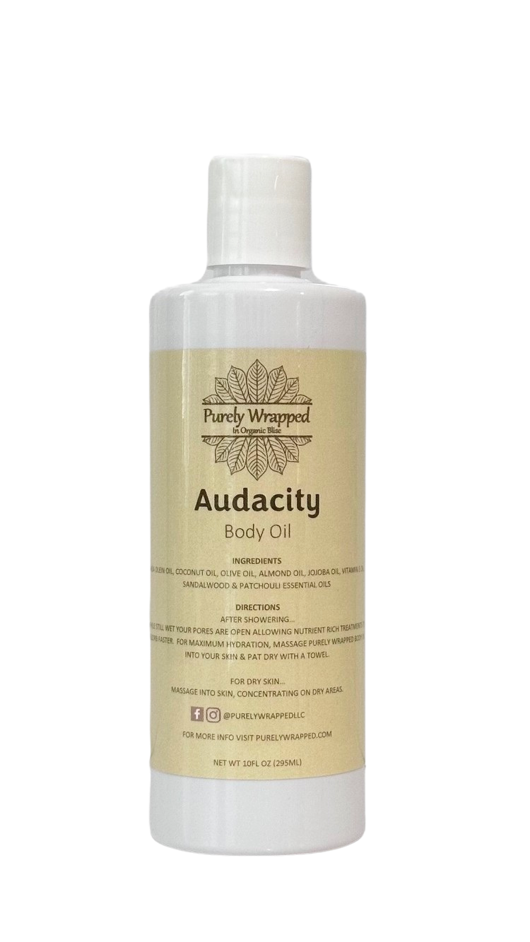 Audacity Body Oil is a subtly sweet, woodsy body oil that soothes & heals dry skin.