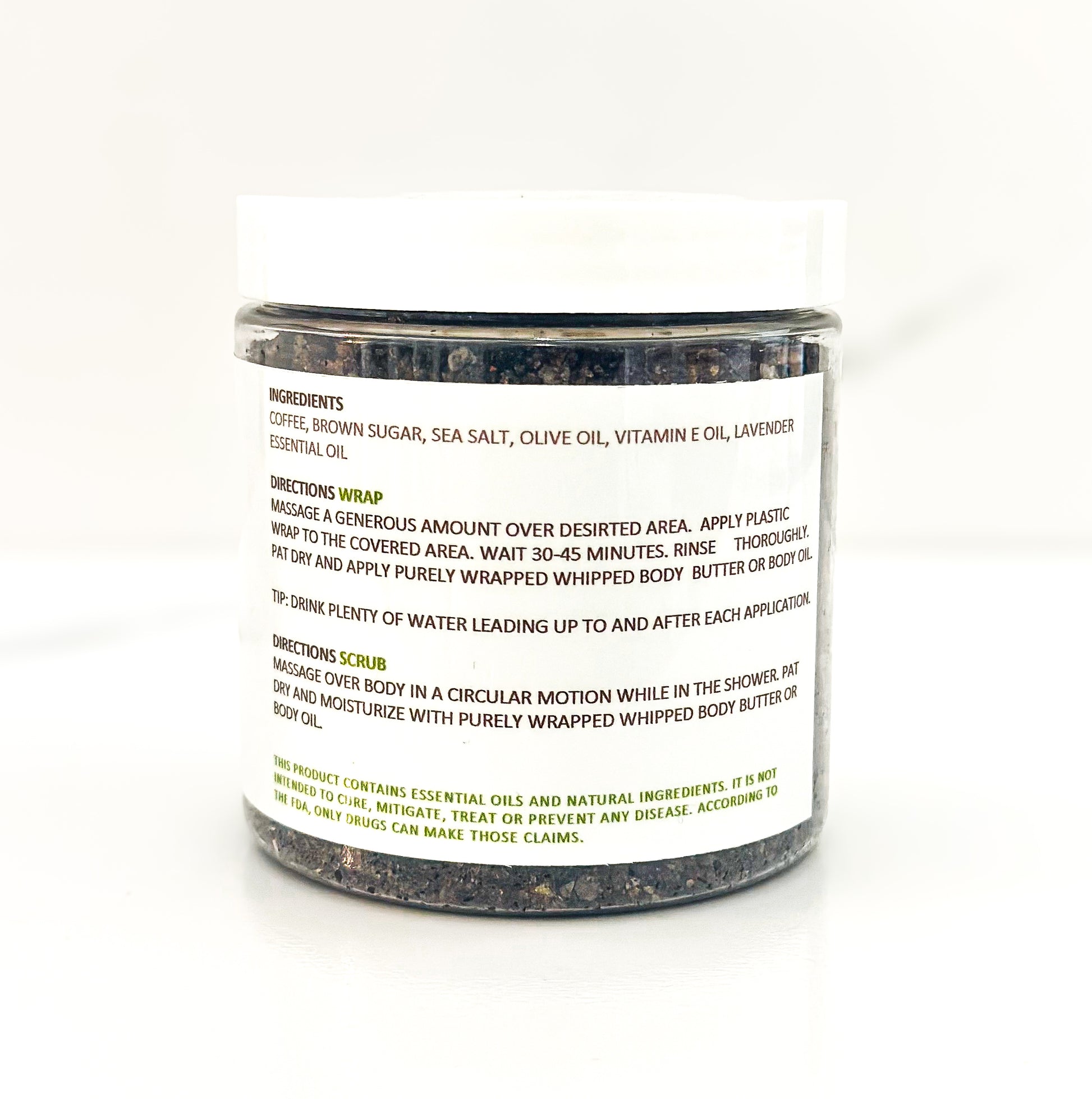 Spread a generous amount over desired area. Apply plastic wrap to the covered area. Wait 30-45 minutes. Rinse thoroughly in the shop. Pat dry and apply Purely Wrapped Whipped Body Butter or Body Oil for a luxurious finish.