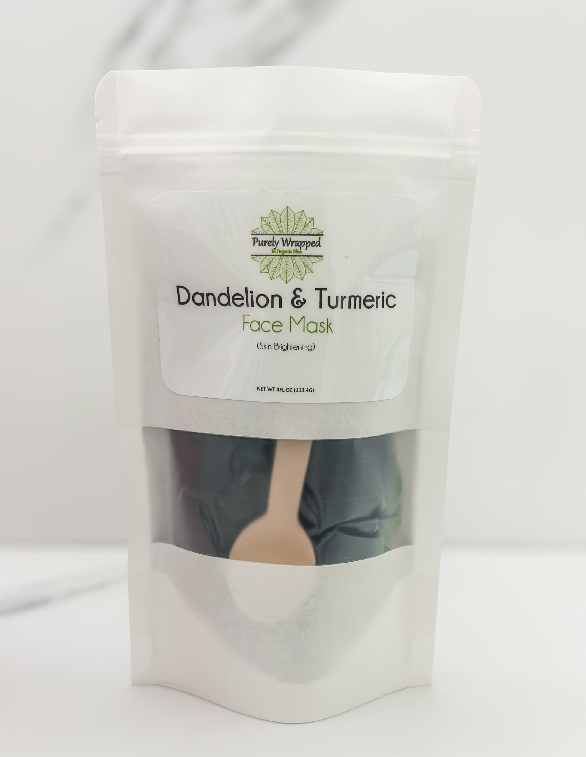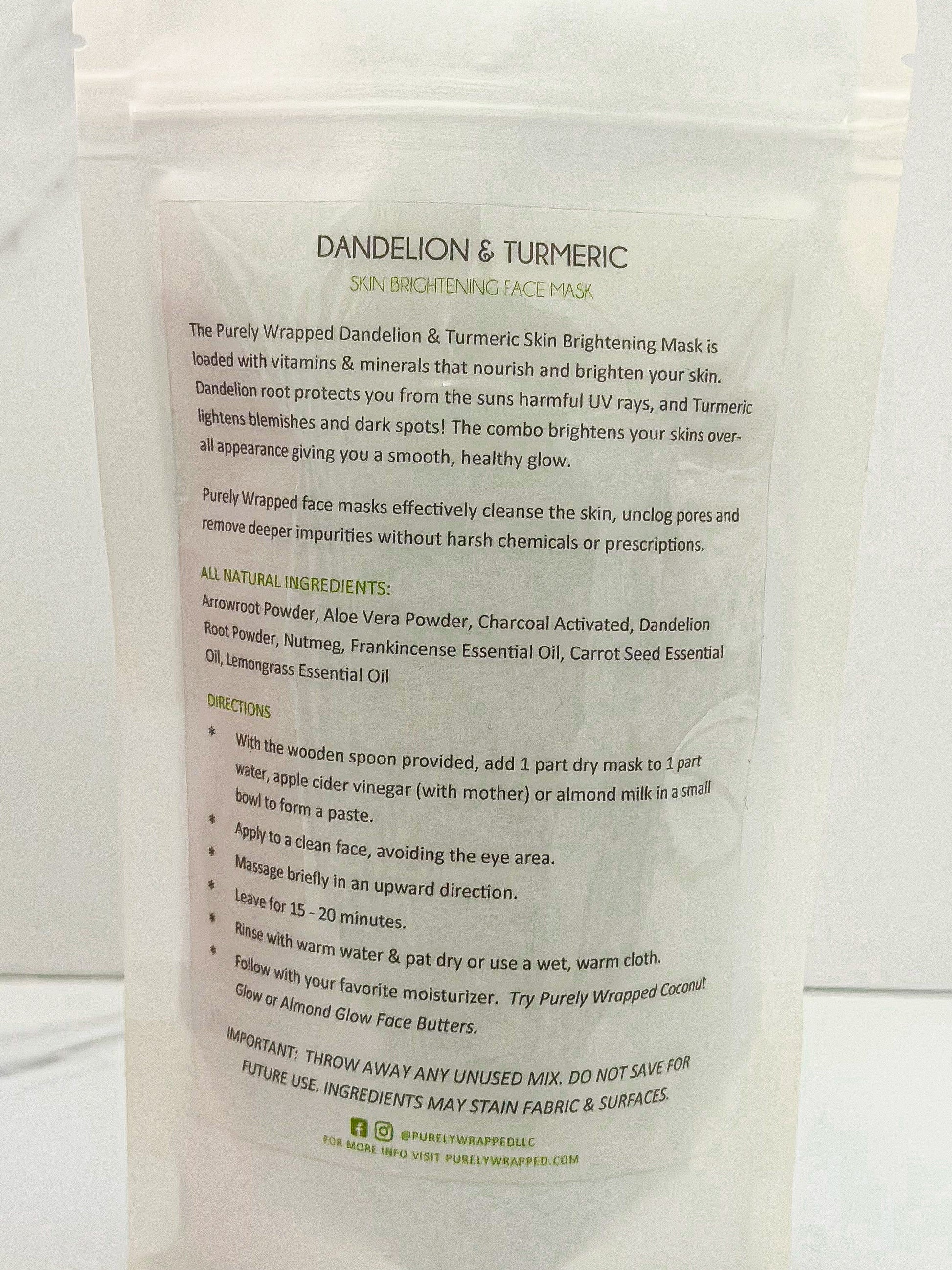 The Purely Wrapped Dandelion & Turmeric Skin Brightening Mask is loaded with vitamins & minerals that nourish and brighten your skin. Dandelion root protects you from the suns harmful UV rays, but turmeric is the star of this show. Turmeric not only lightens your teeth but it also lightens blemishes and dark spots. This combo works together to brighten your skins overall appearance by fighting hyperpigmentation and treating acne wounds and scars.