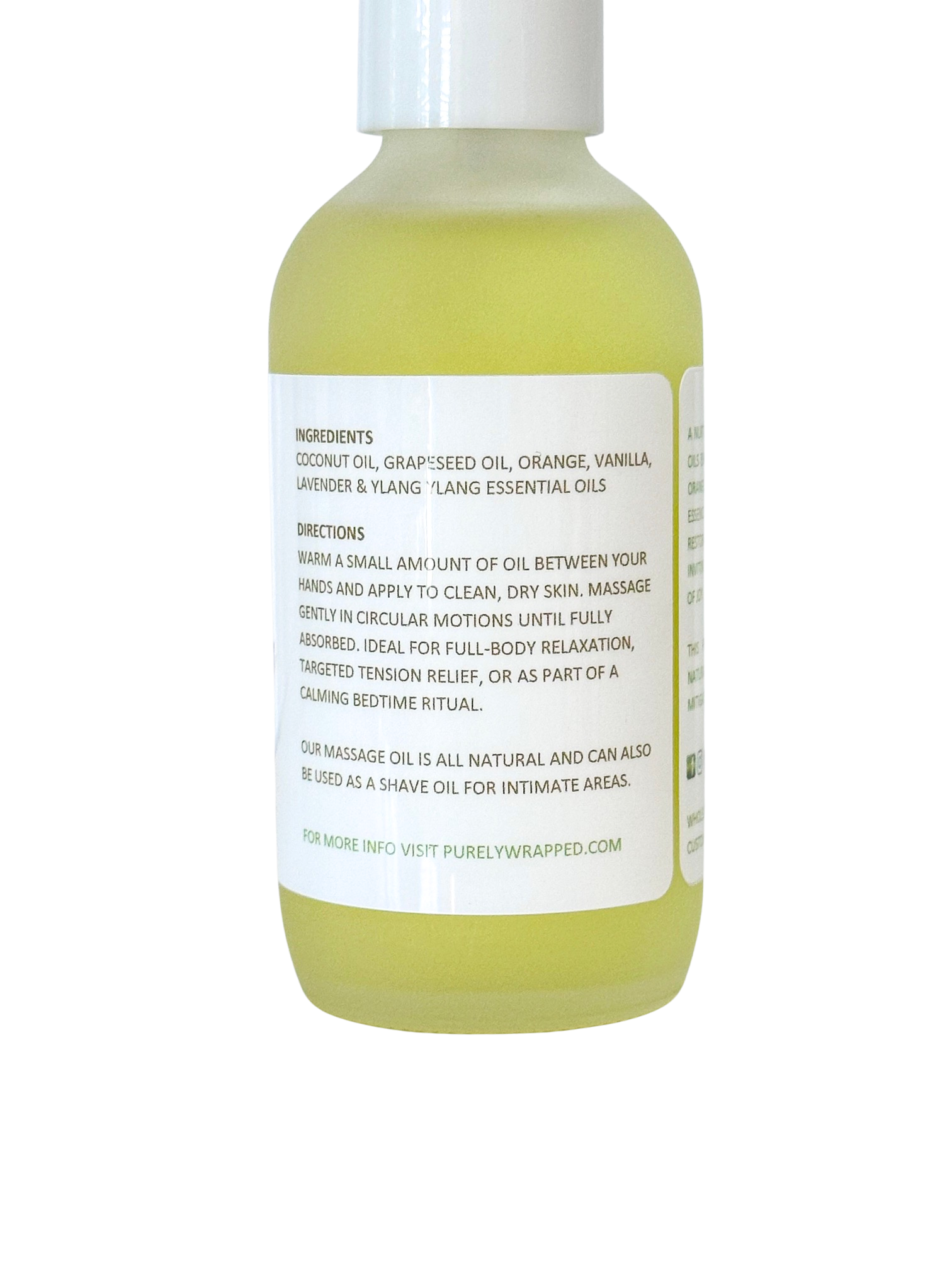 Purely Wrapped Harmony Massage Oil is a nurturing blend of coconut & grapeseed oils, enriched with the uplifting sweetness of orange and vanilla, balanced by the calming essence of lavender and ylang ylang. This restorative formula nourishes the skin while inviting balance, comfort, and a gentle sense of joy.