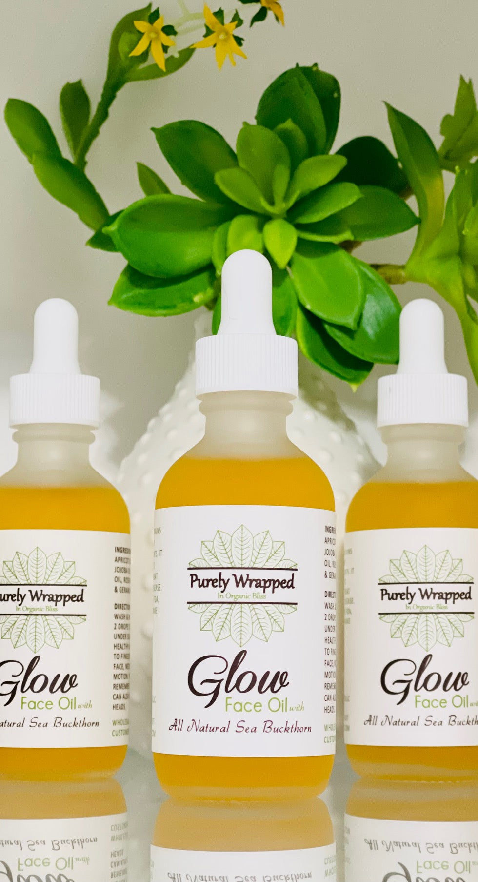 The secret to glowing skin is this super intensive moisturizer. It can be used for treating scars or moisturizing dry, irritated skin. Its made from pure botanicals and natural essential oils. Glow Face Oil is good for all skin types and contains only natures purest botanicals and essential oils. Like Apricot oil, which improves the appearance of wrinkles and scars. Almond Oil, which reduces excess oil on the skin, preventing breakouts. Geranium Oil is antibacterial and anti-inflammatory. It also contains Rosehip Oil which gives this product natural UV Ray protection properties. These are all great, but the ingredient that really makes this product a must have is the Sea Buckthorn Berry & Seed Oil. Sea Buckthorn contains an incredible 190 nutrients and phytonutrients. This amazing component promotes hydration, elasticity, cell regeneration and even helps treat scars. It's anti-inflammatory properties reduce the swelling associated with many skin conditions like eczema, rosacea and psoriasis. Needless to say this 2oz container packs a huge punch!